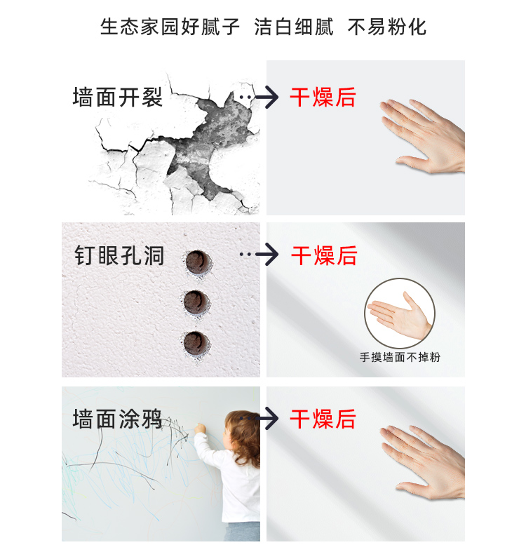 墙面修补膏采用全新水性环保配方,使用优质原料,结合先进工艺生产而成,新一代环保型底材处理产品。具有良好的防霉耐水功效,用于修补墙面出现的钉眼、小范围的开裂、孔洞、刮痕、起皮等墙面问题,具有环保健康、0级防霉、耐水性好、附着力强、无须加水,施工方便等优点。本品开盖即用,批刮后与基层结合牢固,附着力强,细腻平滑,装饰性好。本品适用于室内墙面乳胶漆涂刷之前的基层平整处理。